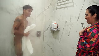 Big-assed stepmom ends up fucking her skinny stepson after spying on him in the shower